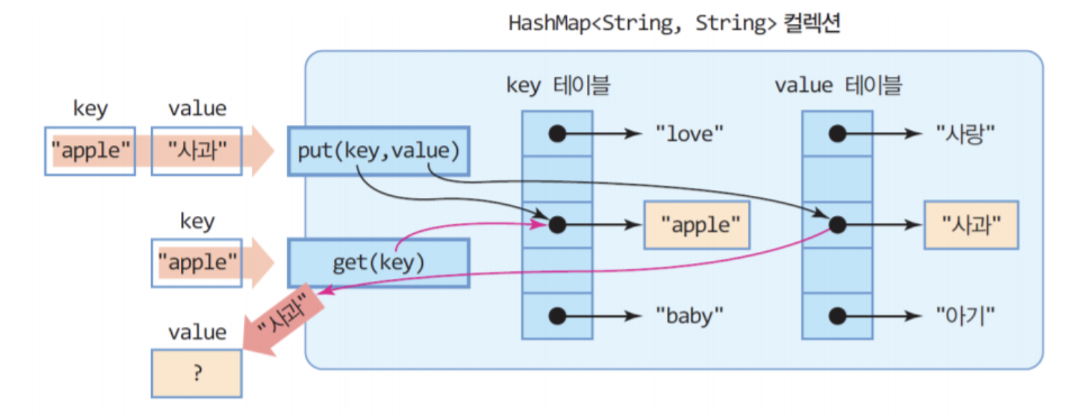 HashMap<String, String> map = new HashMap<String, String>(); // ํด์๋งต ์์ฑ map.put("apple", "์ฌ๊ณผ"); // ๊ฐ์ ์ฝ์ . ๋ง์ฝ์ ํค์ ํด๋นํ๋ ๊ฐ์ด ์ด๋ฏธ ์กด์ฌํ๋ค๋ฉด, ์์ ๋จ. String kor = h.get("apple"); // ํค์ ํด๋นํ๋ ๊ฐ์ ๊ฒ์.